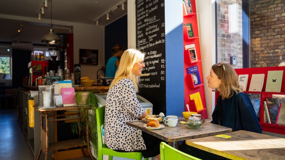Mottoet er at lykkelige mennesker læser bøger og drikker kaffe, og det mærker man, så snart man træder ind. Kaffen er lige så kurateret som boghylderne: baristaerne går op i bønner, bryg og små detaljer, så hver cappuccino føles som en anbefaling i sig selv. Du kan synke ned i den magelige sofa med en bog, eller tage plads ved vinduerne og se livet glide forbi på Valby Langgade.